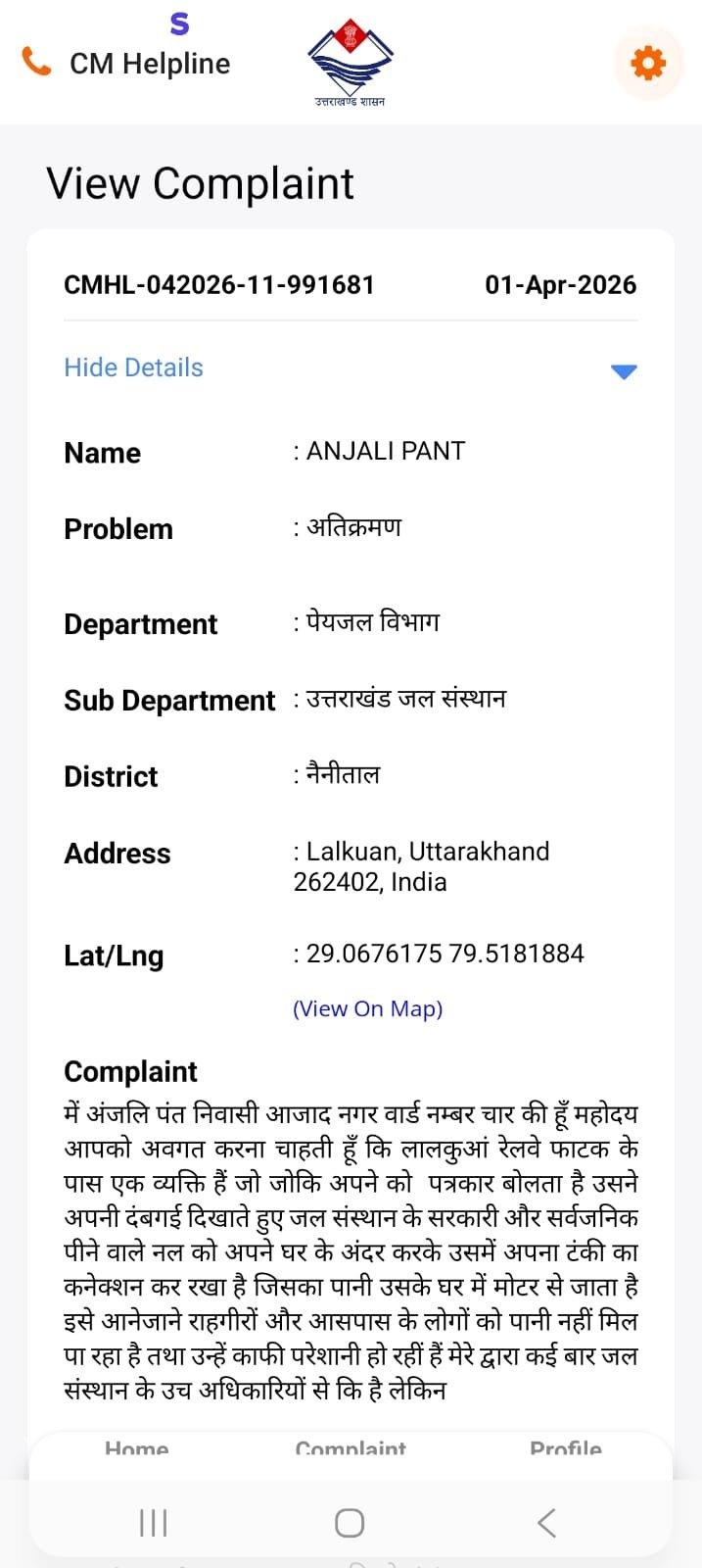अब अंजलि पंत ने इस प्रकरण की शिकायत मुख्यमंत्री समाधान पोर्टल पर दर्ज कराते हुए क्षेत्रवासियों को न्याय दिलाने की गुहार लगाई है।
